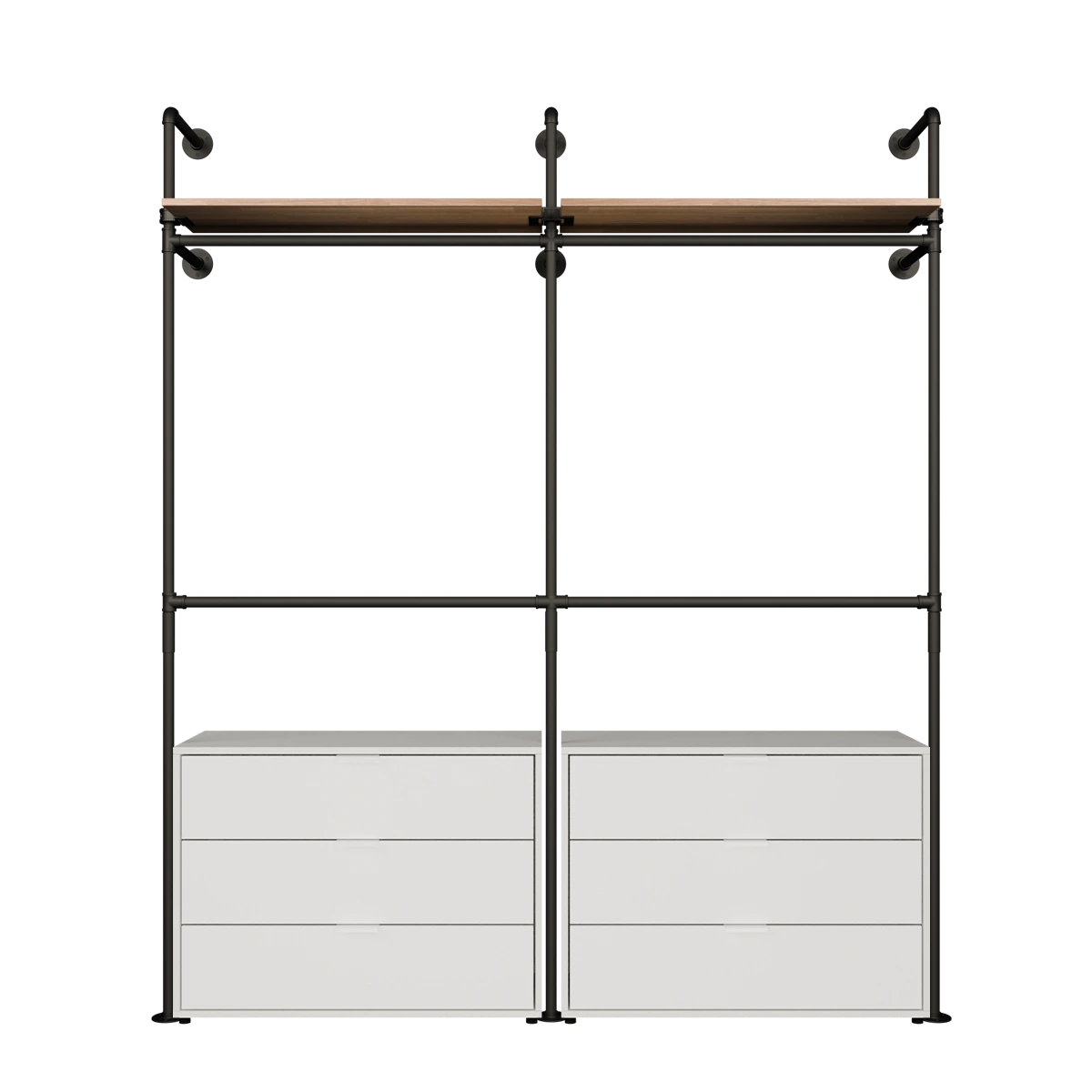 With the matte black powder coating of our water pipes and the dark wood of the wall shelf, our pipe furniture adds a rustic touch to your Industrial Design. Your clothes will stand out in the simple black color, elegantly taking center stage.