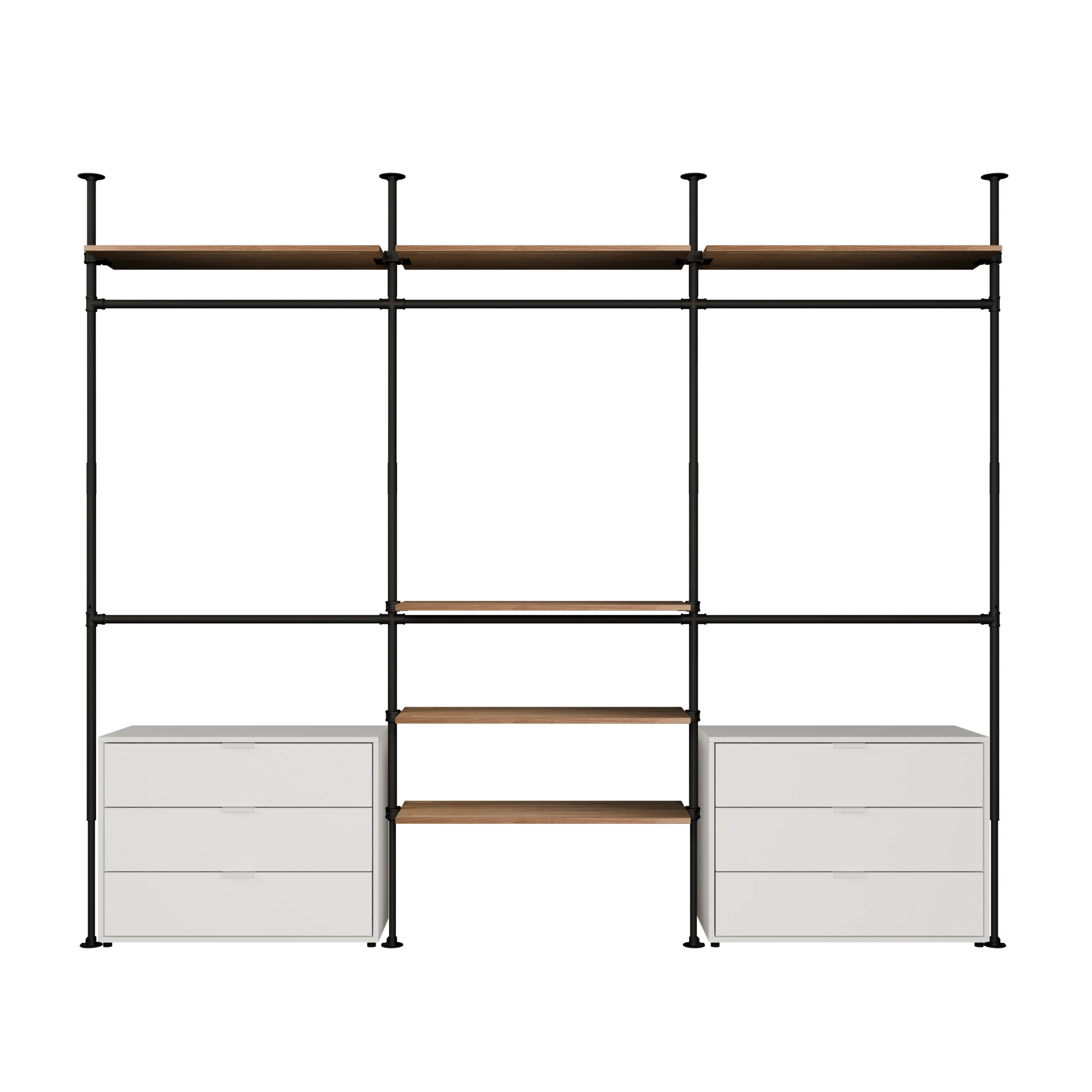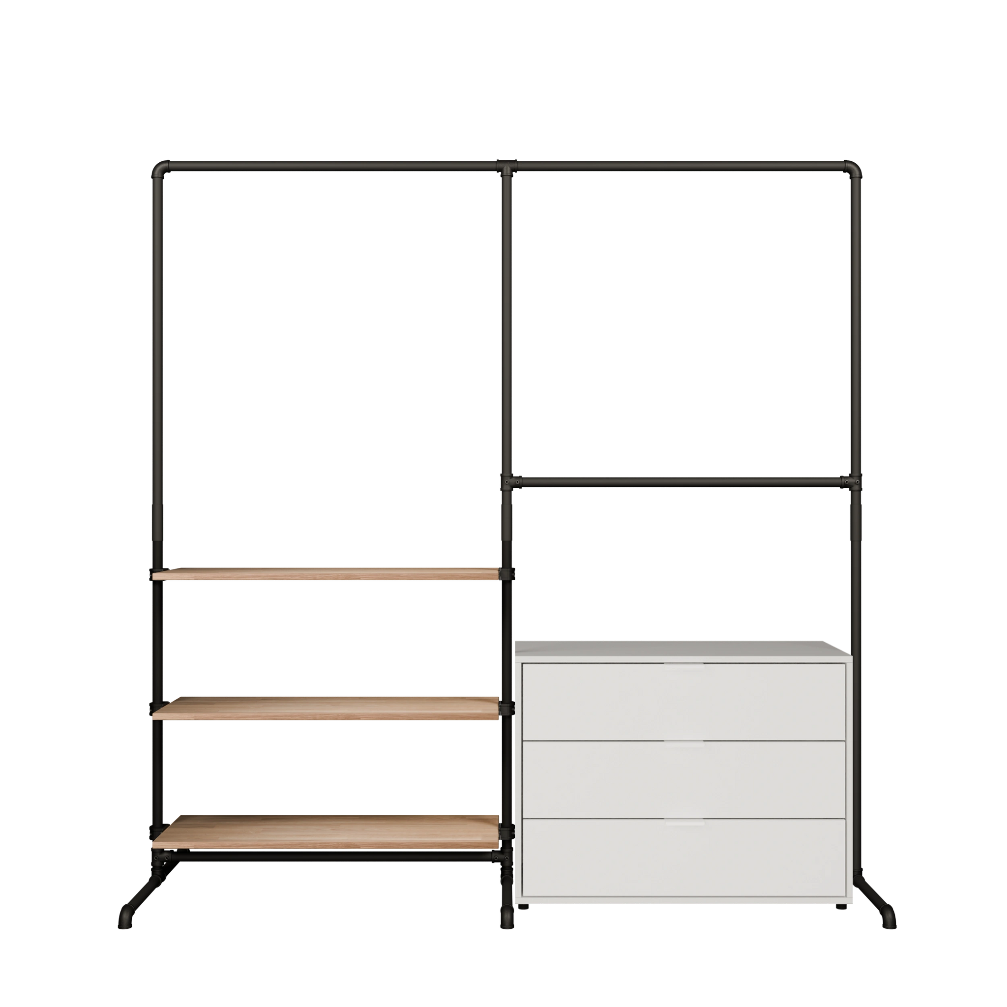 The Clothing Rack Shelf JONTE OAK provides so much space with its combination of high hanging space and double crossbar that it can hold all your clothes and additionally offers even more storage options through the metal wood wall shelf. Depending on what kind of shelf clothing rack you're looking for, you'll find the right metal wood wall shelf for your open wardrobe with us. Do you like our shelf clothing rack but are moving soon and unsure if it will still fit? The metal wood wall shelf is easily expandable, as its thoughtful design allows you to adjust it to fit your current needs.